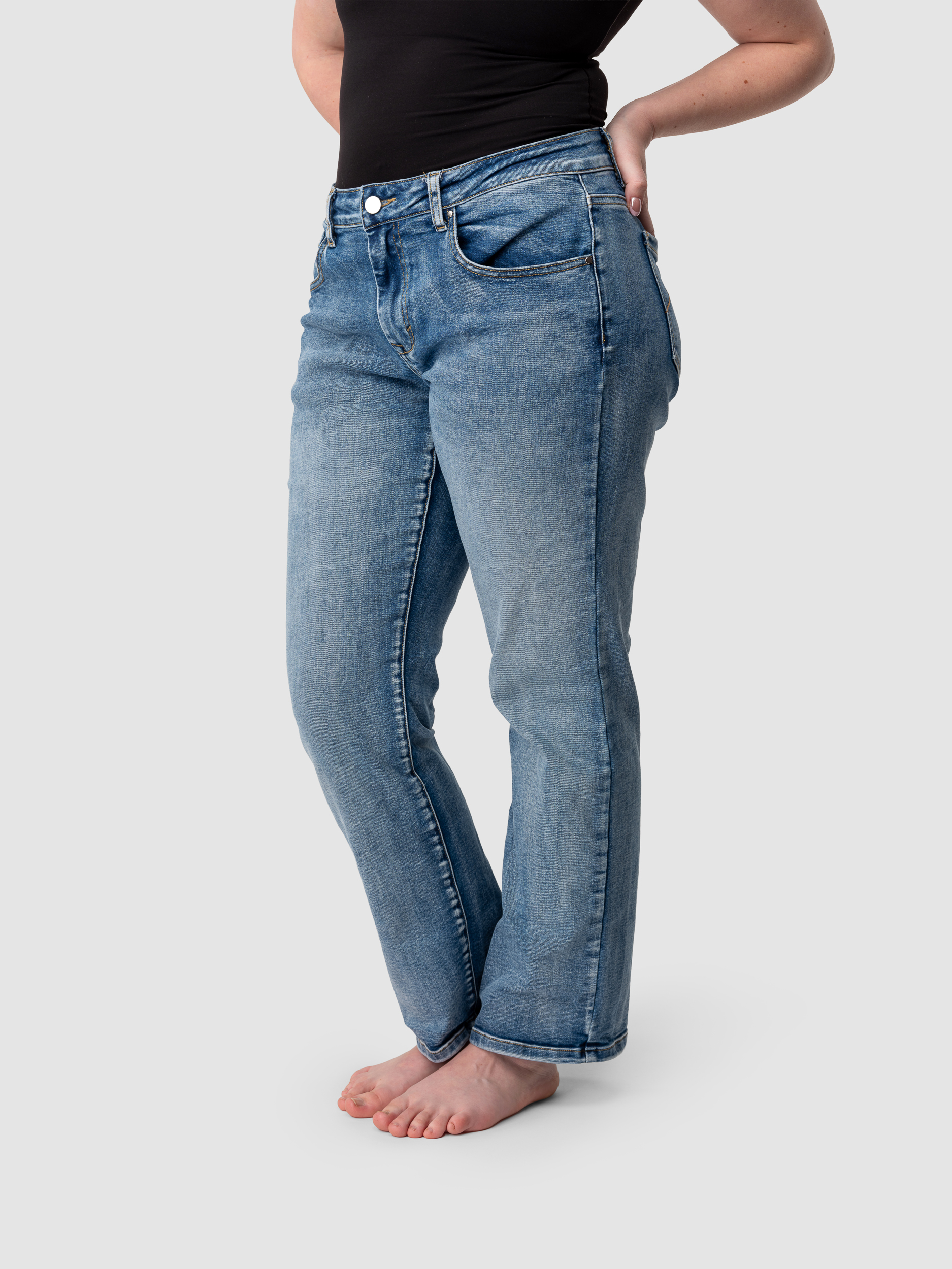 Straight-leg fit, designed specifically for short, curvy bodies with a contoured waist-to-hip ratio.
